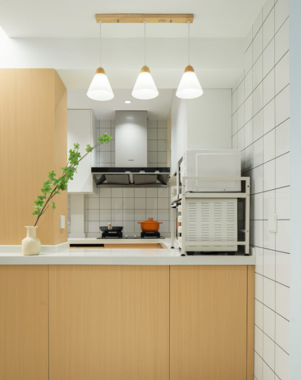 木质橱柜与白色台面呼应不仅增加了扩大了空间,且大大提升了利用率,加强了收纳能力。木质的暖调,是选材的初衷,与白色相互搭配,凸显色调清爽的同时,营造舒适温暖的同时提升层次感。