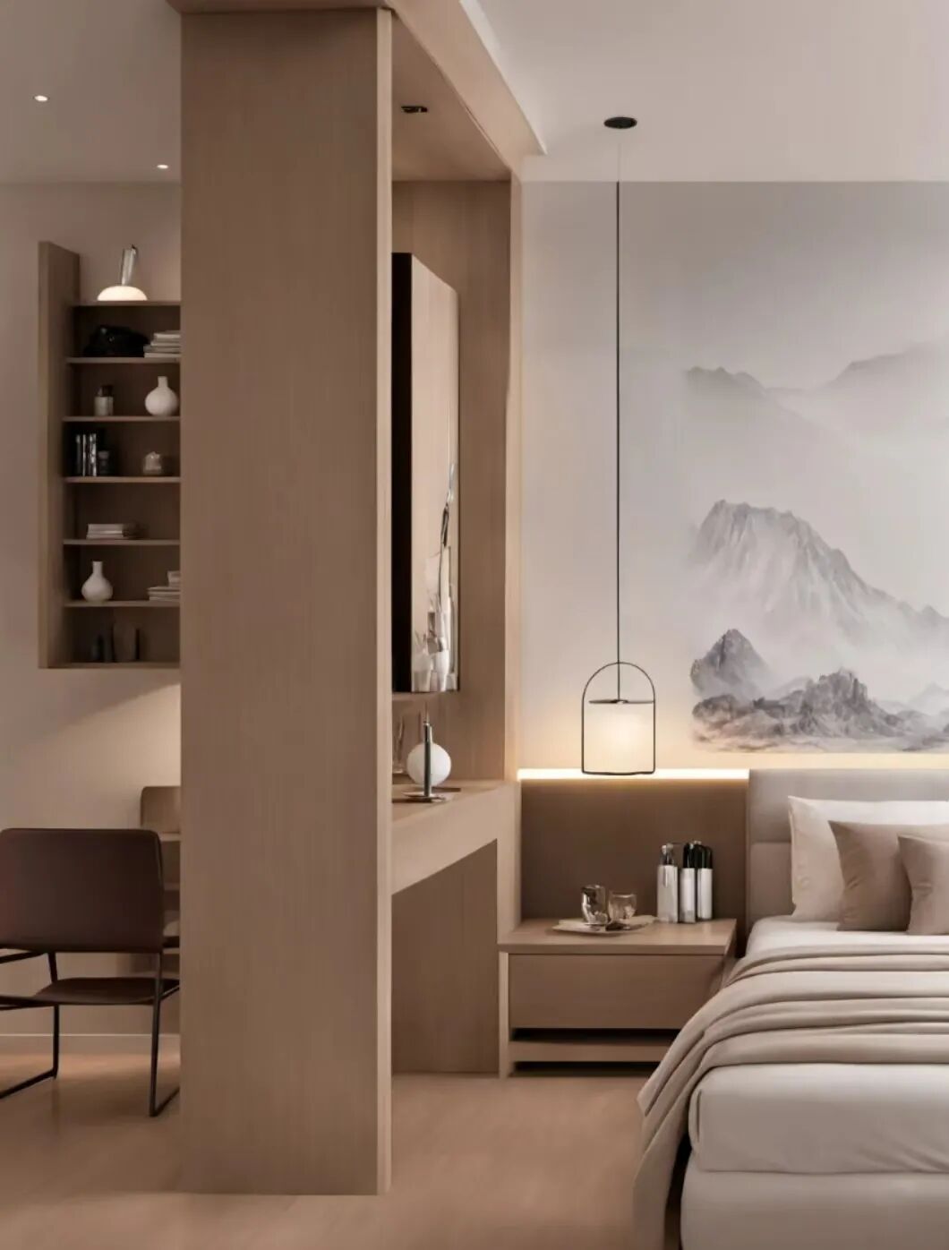 山水元素:水墨挂画、山形摆件,把东方意境藏在细微处,不刻意却有韵味。